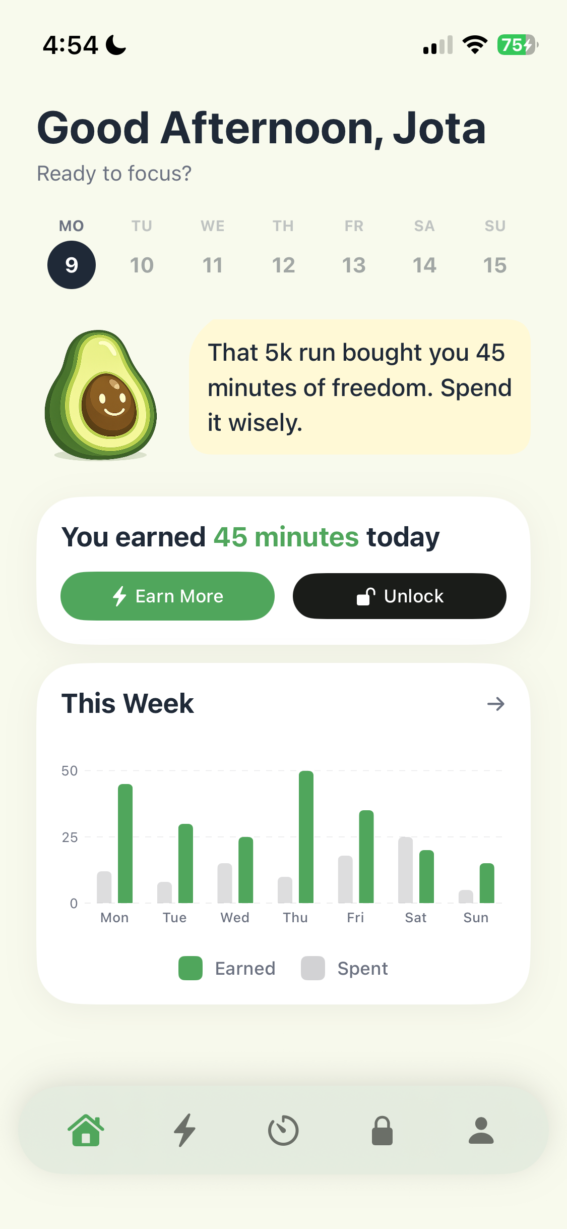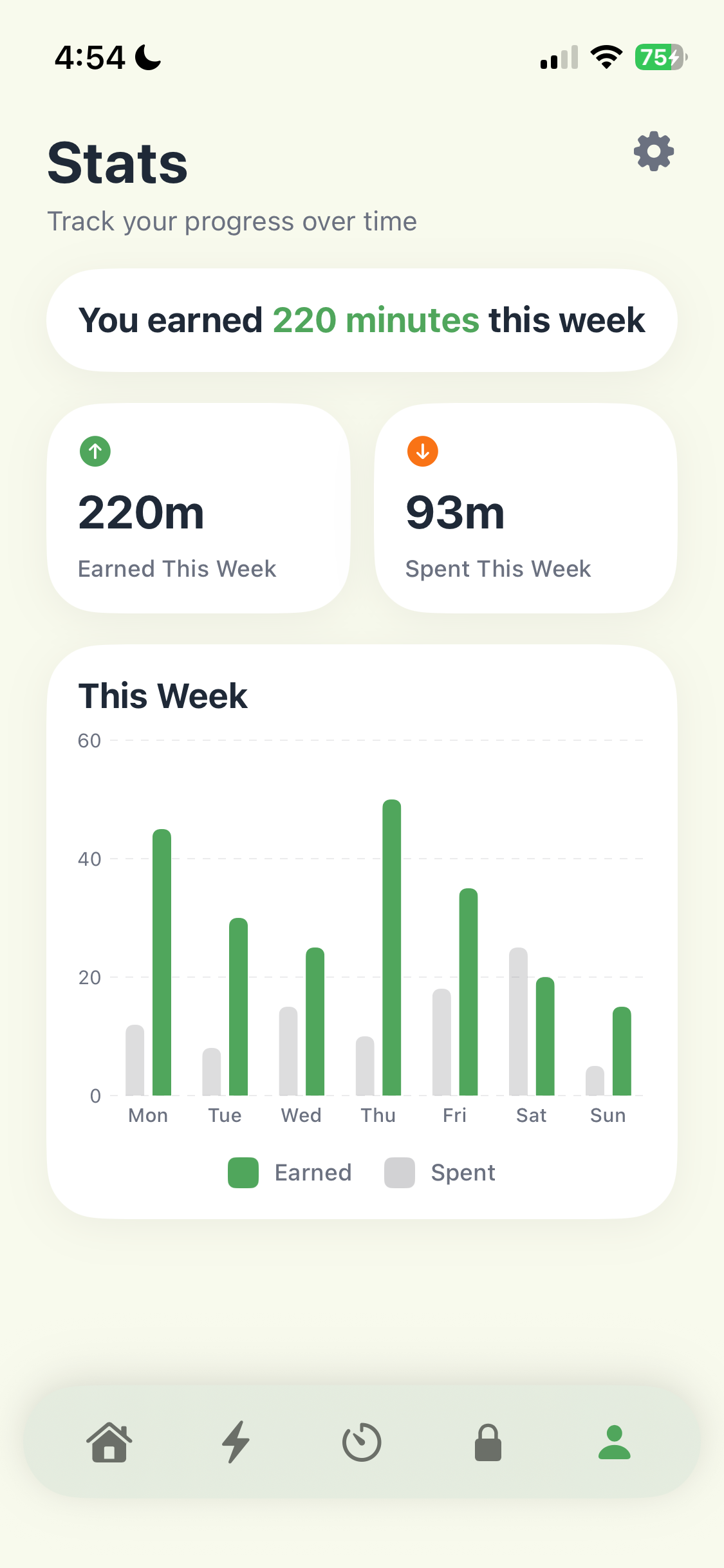 See your earned minutes stack up against your screen time week by week. The longer your streak, the stronger your habits — and the less you even want to unlock those apps.