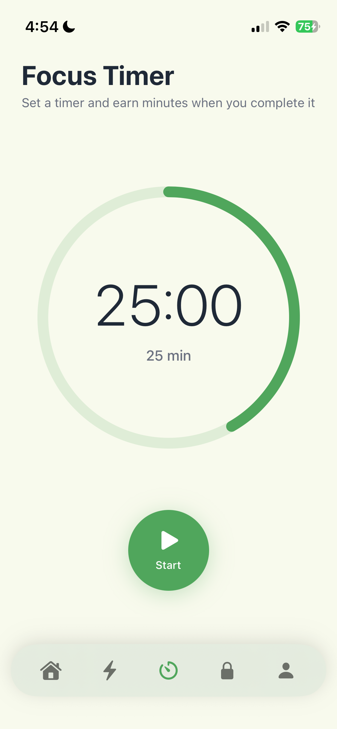 Hit start and the timer begins. Complete the session or bank whatever time you put in. Every minute of focus becomes a minute of screen time.
