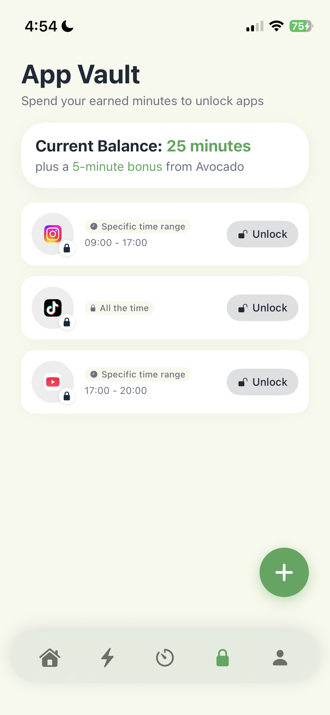 Lock distracting apps in the Vault. When you want to scroll, spend your earned minutes. You decide what's locked and when it opens.